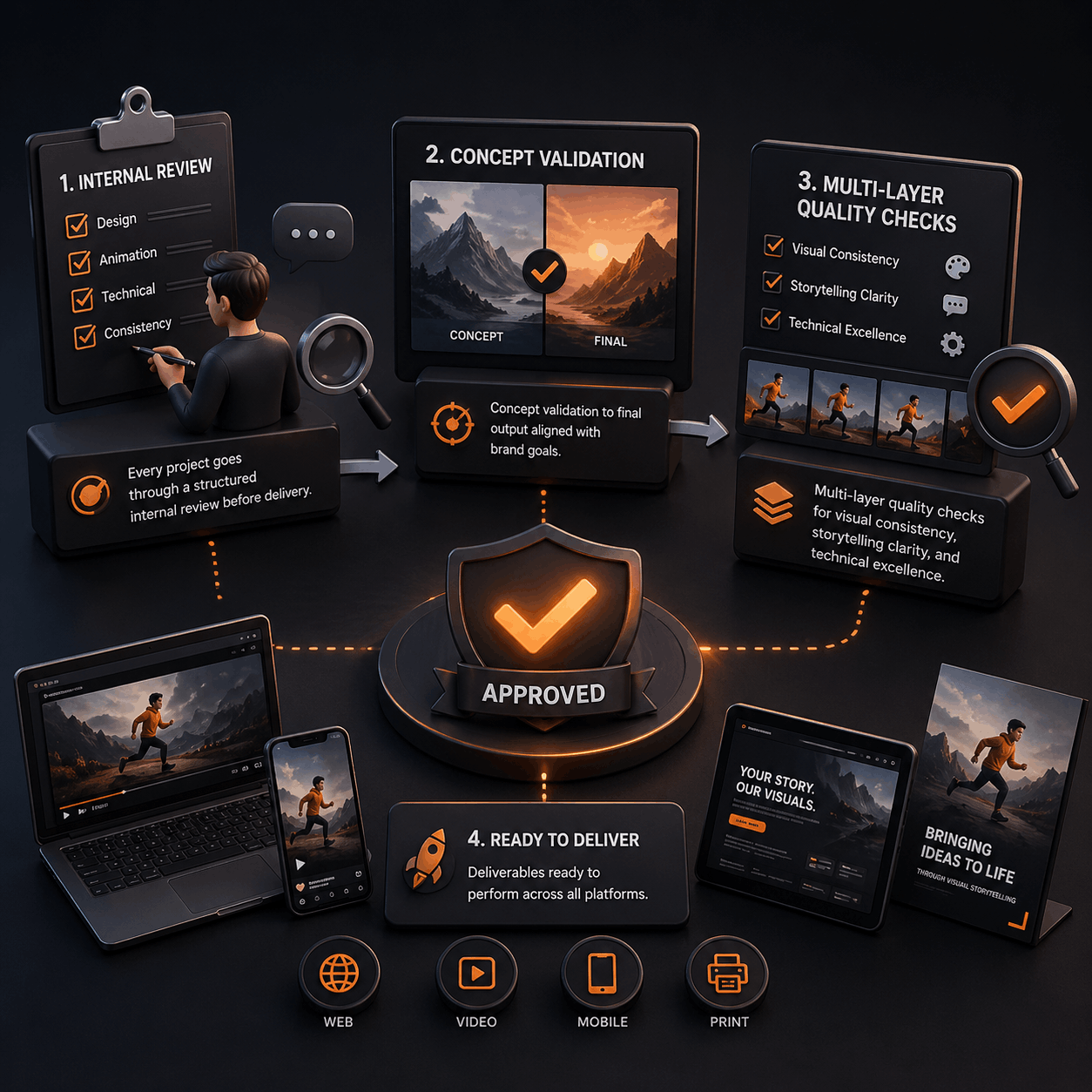 - Multi-layer quality checks for visual consistency, storytelling clarity, and technical excellence